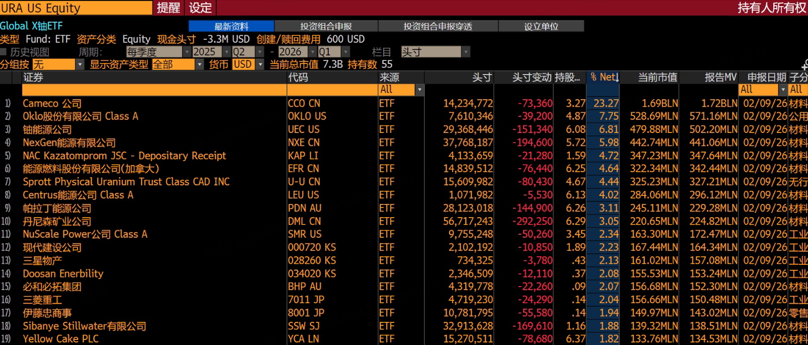 $Global X Uranium ETF(URA)$ 总资产约约 73 亿美元,费用率为 0.69%。其主要持仓包括 $Cameco Corp(CCJ)$ (约 23.27%)、 $Oklo Inc.(OKLO)$ (约 7.75%)、 $Uranium Energy Corp(UEC)$ (约 6.81%)以及 $Nexgen Energy Ltd.(NXE)$ (约 5.98%)。整体配置明显集中于铀资源与核燃料上游企业,因此对铀价格波动较为敏感。在铀价格上行阶段表现更为明显,但回撤也会同步放大,更适合愿意承担周期波动的投资者。