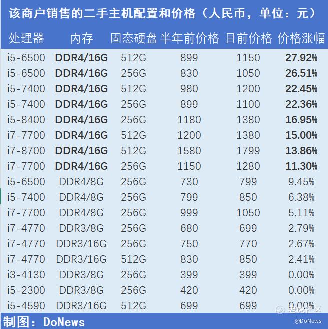 下图是DoNews整理的其店铺现在和半年前不同配置的价格对比,不难看出,涨价的幅度与内存强相关,涨幅靠前的配置组合都包括DDR4内存,其中包含16G内存的配置组合涨价都在10%以上,与商家所说的“大概翻了三四倍”相符合,而DDR3内存对价格几乎不存在影响。