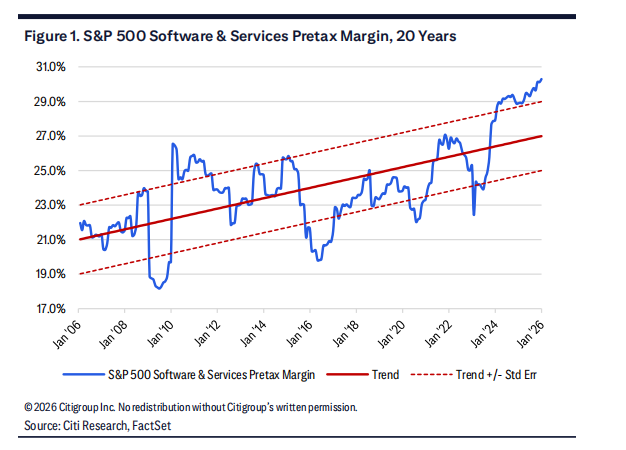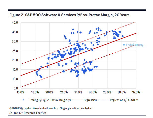 当我们思考终值倍数以及投资者如何评估它们时,利润率和盈利趋势是一个良好的起点。如图 1 所示,鉴于过去二十年税制变化,我们关注软件与服务的税前利润率,该指标已触及历史高位。它们远高于一个标准误差区间,并自 2023 年初以来显著扩张。毫无疑问,这在某种程度上已嵌入当前行业估值中,但已渗透到不断上升的终值讨论中,尤其是随着更多基础业务达到规模。