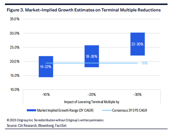 然而,若我们假设投资者将支付低 30% 的终值倍数,则近期增长必须显著强于当前卖方一致预期,才能支撑当前价格。