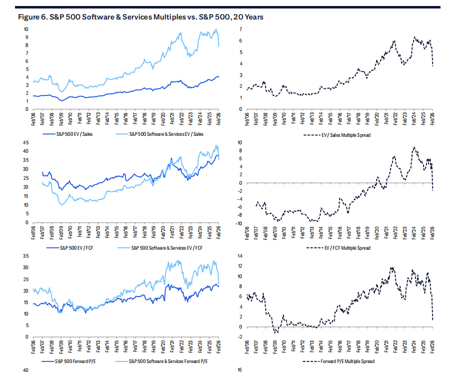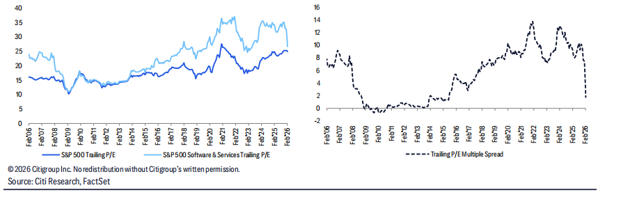 投资者可能继续追问的问题是:对于那些可能不仅仅是 AI 增强功能的使用者,还可能成为新业务颠覆目标的软件与服务公司,其长期底部在哪里?目前,对于更广泛的、相对同质化的板块,抛售已完全削减了约 10% 的终值倍数,符合我们的估计。