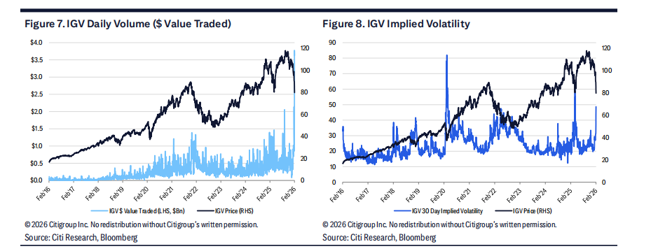 从极短期看,主要软件 ETF 之一——iShares 扩展科技软件板块(IGV)的交易活动具有参考意义。