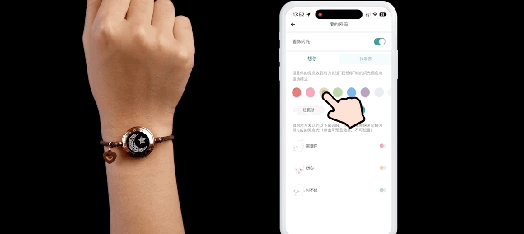 没有复杂的语言,没有繁琐的操作,只需轻轻摸一下佩戴在手腕的首饰,另一端的人,就能感受到专属的闪光与震动,这是独属于两个人的「情感密语」。