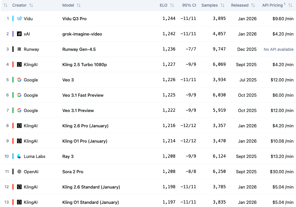 在国际权威AI基准测试机构Artificial Analysis 最新公布的文生视频模型榜单中,Vidu Q3排名全球第一,超越马斯克xAI Grok,Runway Gen-4.5 ,Google Veo3.1和 OpenAI Sora 2等一众厂商。