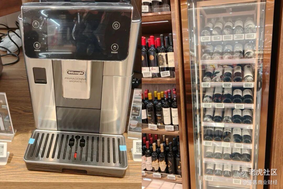 据「零售商业财经」的观察,华豫佰佳的咖啡区、红酒区的品类和设计主打高端化,不仅配备了专业的冷藏红酒柜,咖啡周边的货架上还摆放着一台德龙ECAM630.75全自动咖啡机。