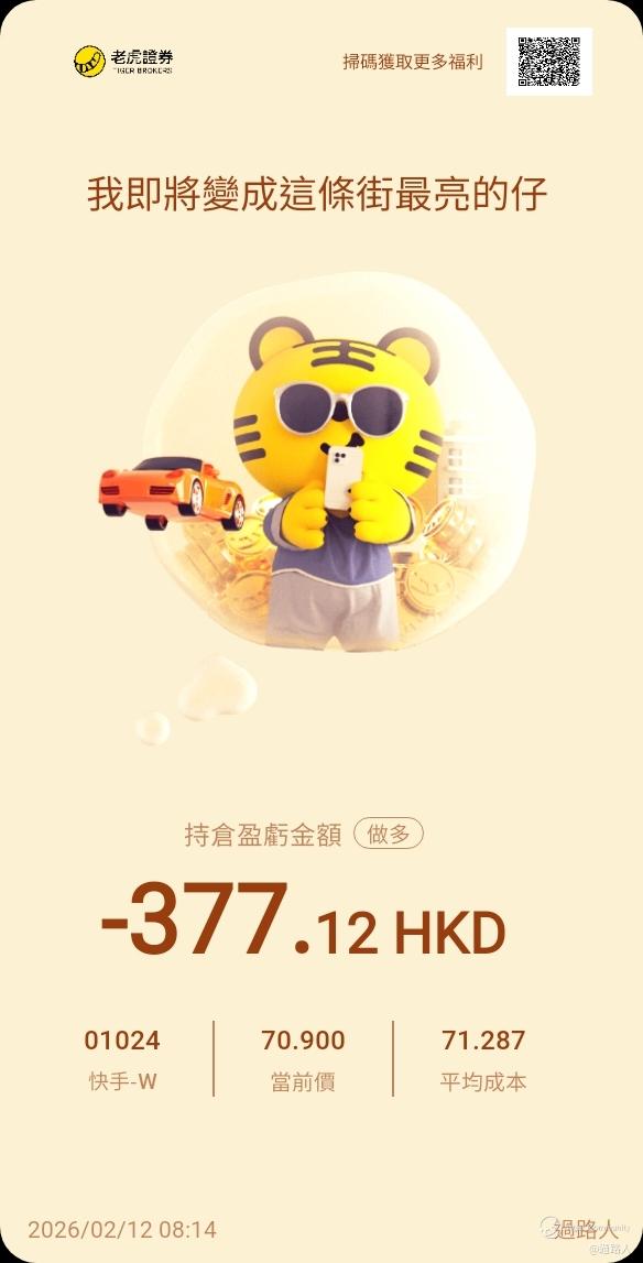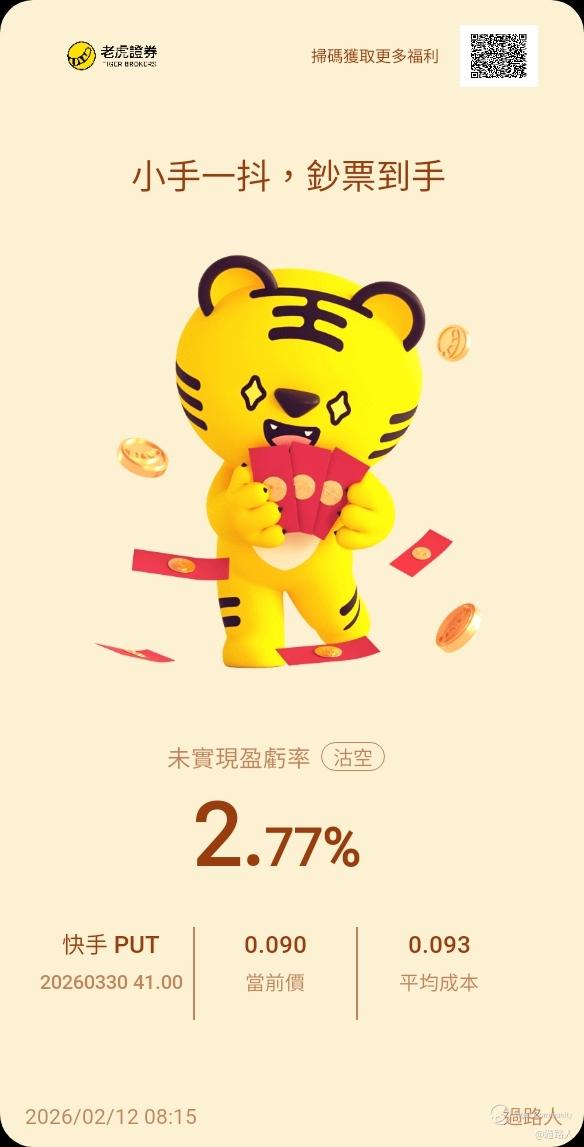 昨日表现比较好既竟然系$小米集团-W(01810)$ 雷军一出口.股价立即有所反应。一骑就弹反几个%。收市大升[看涨] 4.27%。可以系37之上收市算系高位。不过今年仲系下跌紧5.6%。如果上到接近40。我觉得要跑啦。。 $快手-W(01024)$ 自比罚款1亿多的那个交易日股价表现差之外。都开始回升过来。当日底见67.5。我亦把握了机会入了正股及卖put了比67.5更底既期权。罚果少少钱湿湿碎啦 $腾讯控股(00700)$ 或者就快不行了,我的信心崩溃了。或者亲口请你快走了,好快走了,让我知道我们完了,没了。连550都穿埋唔走仲等几时?twins话斋:丢假[邪恶] [邪恶] $KST.HK 20260213 67.50 PUT$ $KST.HK 20260330 41.00 PUT$ 。
