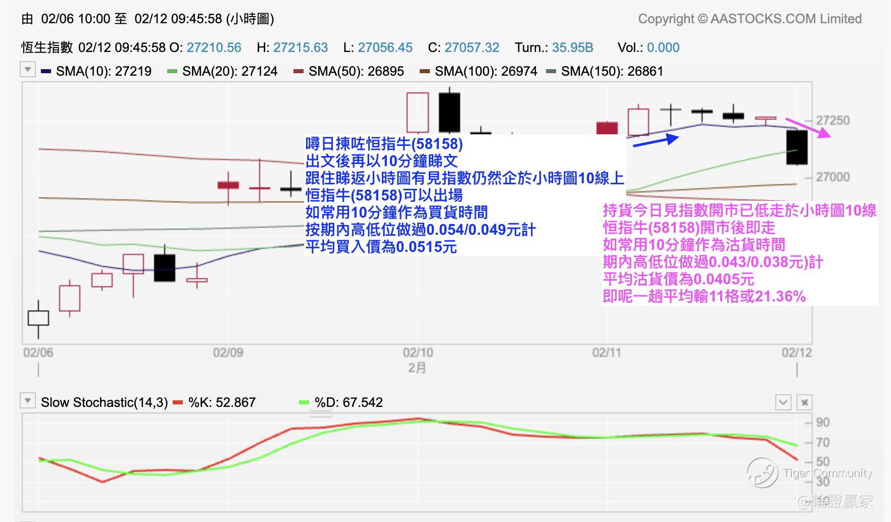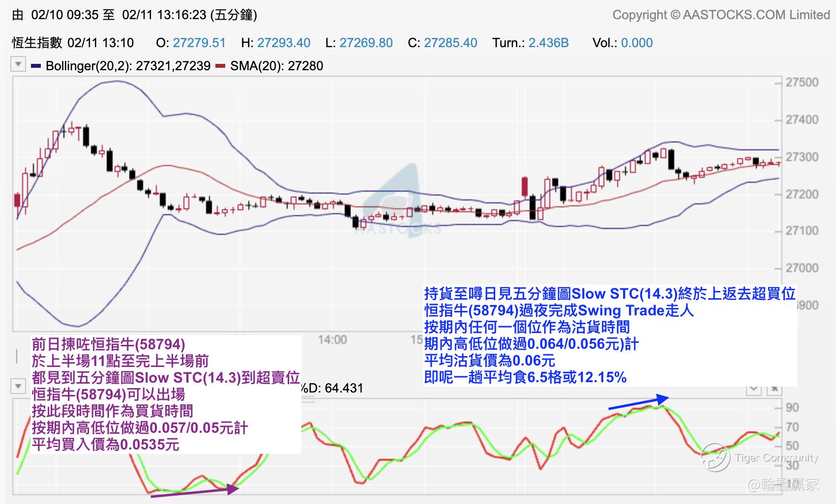 先睇返前日拣嗰只 $UB#HSI RC2812D.C(58794)$ 先,出仓Plan系用返番平时五分钟图做Swing Trade嘅方法去做,但由于前日下半场未见Slow STC(14.3)上番超买,带过夜至㖊日上半场终于都见到,所以过夜(58794)走得。