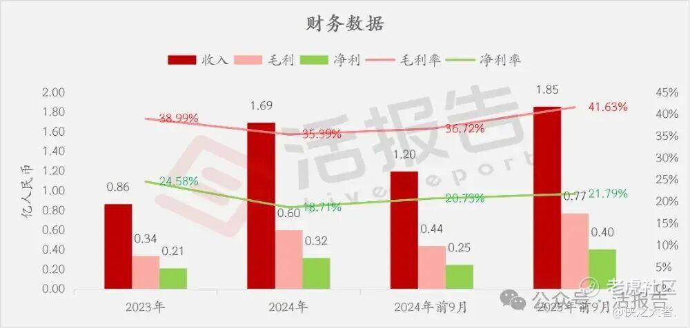 公司是中国领先的企业AI智能体解决方案提供商。2024年收入1.69亿元,净利润0.32亿元,毛利率35.39%。2025年前9月收入1.85亿元,净利润0.40亿元,毛利率41.63%。2025年前三季度公司净利同比增长超60%。