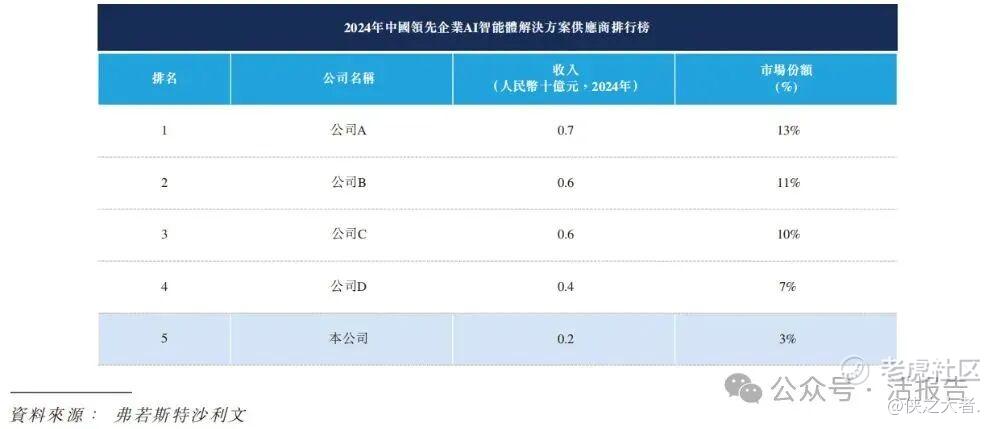 按2024年收入计,公司是第五大中国企业级AI智能体解决方案提供商,市场份额为3.0%。