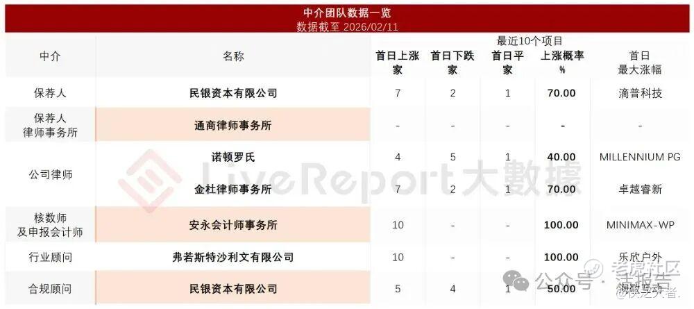据**大数据统计,第零智能中介团队共计7家,其中保荐人1家,近10家保荐项目数据表现普通;公司律师共计2家,综合项目数据表现有待提升。整体而言中介团队历史数据表现尚可。