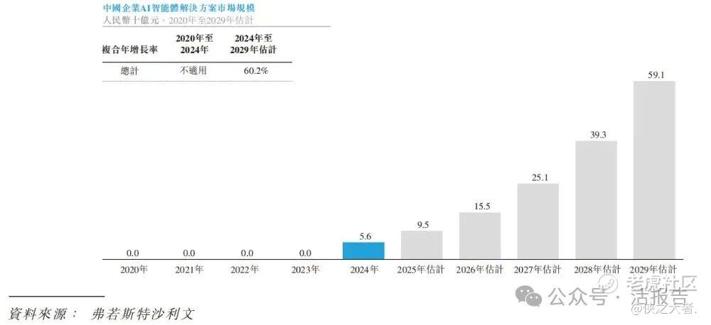根据弗若斯特沙利文(Frost & Sullivan)的报告,中国企业级AI智能体解决方案市场规模将从2024年的人民币56亿元增至2029年的人民币591亿元,2024年至2029年的复合年增长率将达到60.2%。
