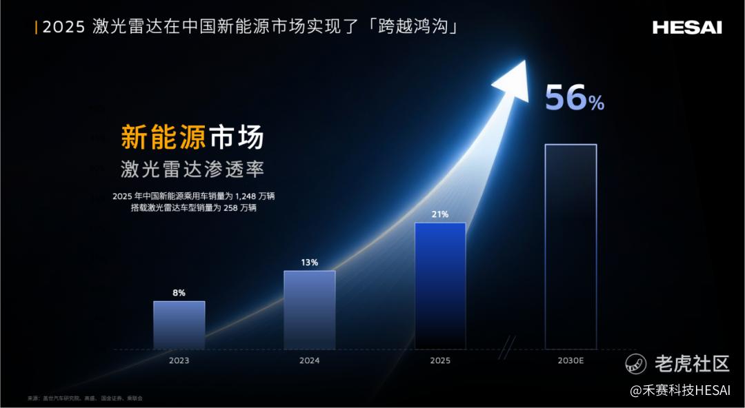 2025 年,激光雷达行业已进入到“跨越鸿沟”[2]关键节点。据盖世数据,2025 年新能源乘用车销量为 1248 万辆,搭载激光雷达车型销量为 258 万辆,激光雷达渗透率高达 21%,单月最高达 28%,相当于每四辆新能源新车就有一辆配备激光雷达。尤其值得关注的是,2025 年 11 月至 12 月,激光雷达在整个乘用车市场的渗透率已达 17%-19%,首次跨越 16%的“鸿沟临界点”,标志着激光雷达技术已完成早期市场到主流市场的关键跃迁,正式进入规模化普及新阶段。行业预测,至 2030 年,激光雷达在新能源车中的渗透率有望提升至 56%,市场规模将持续“倍增”[3]。