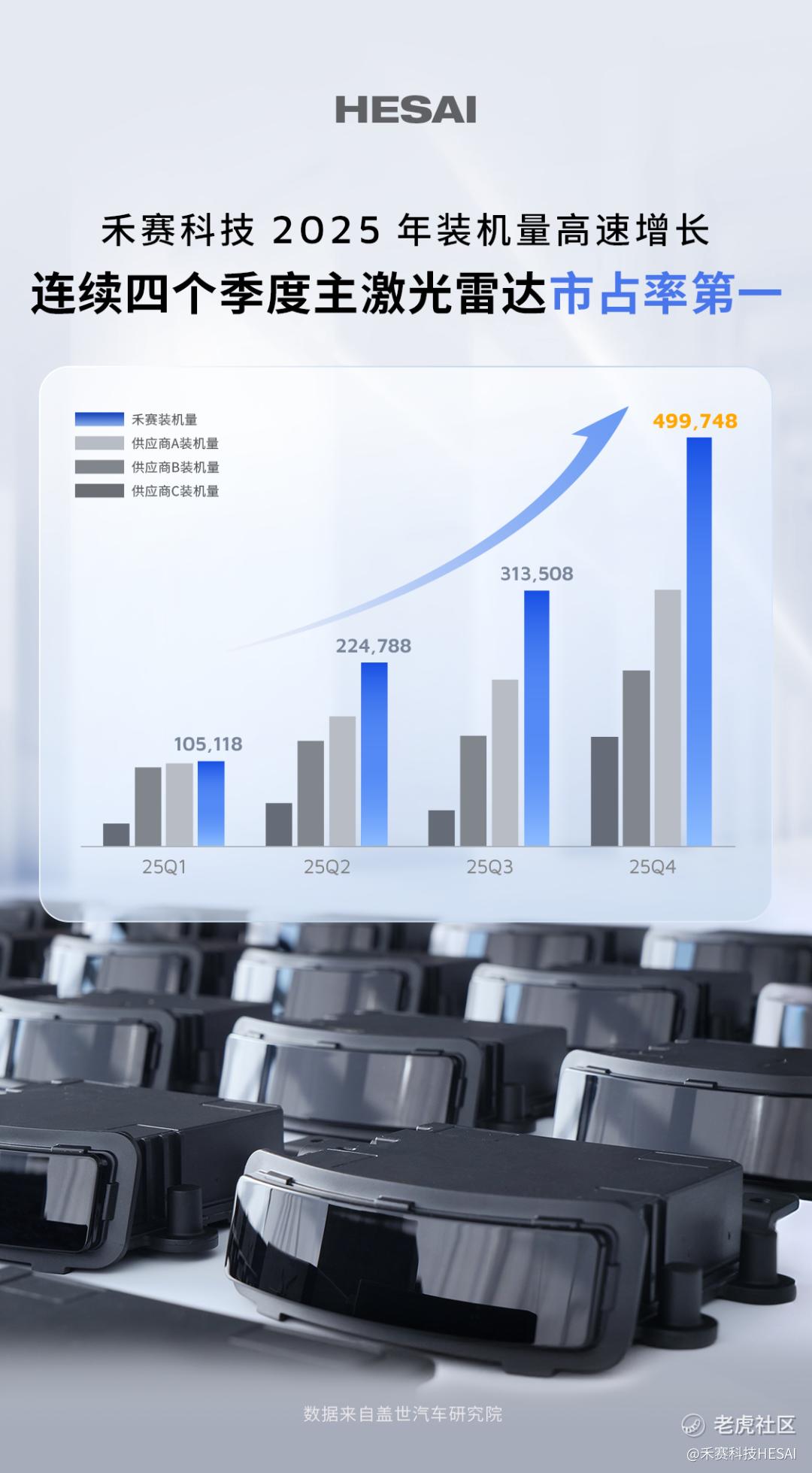 据盖世数据,2025 年,中国乘用车市场主激光雷达总装机量为 275.6 万台,禾赛贡献 114.3 万台,装机量是行业第二名的近 1.5 倍、第三名的近 2 倍。目前,禾赛激光雷达总装机量已连续 5 年翻番,在中国乘用车市场装机量同比提升近 3 倍,持续领跑规模化量产赛道。