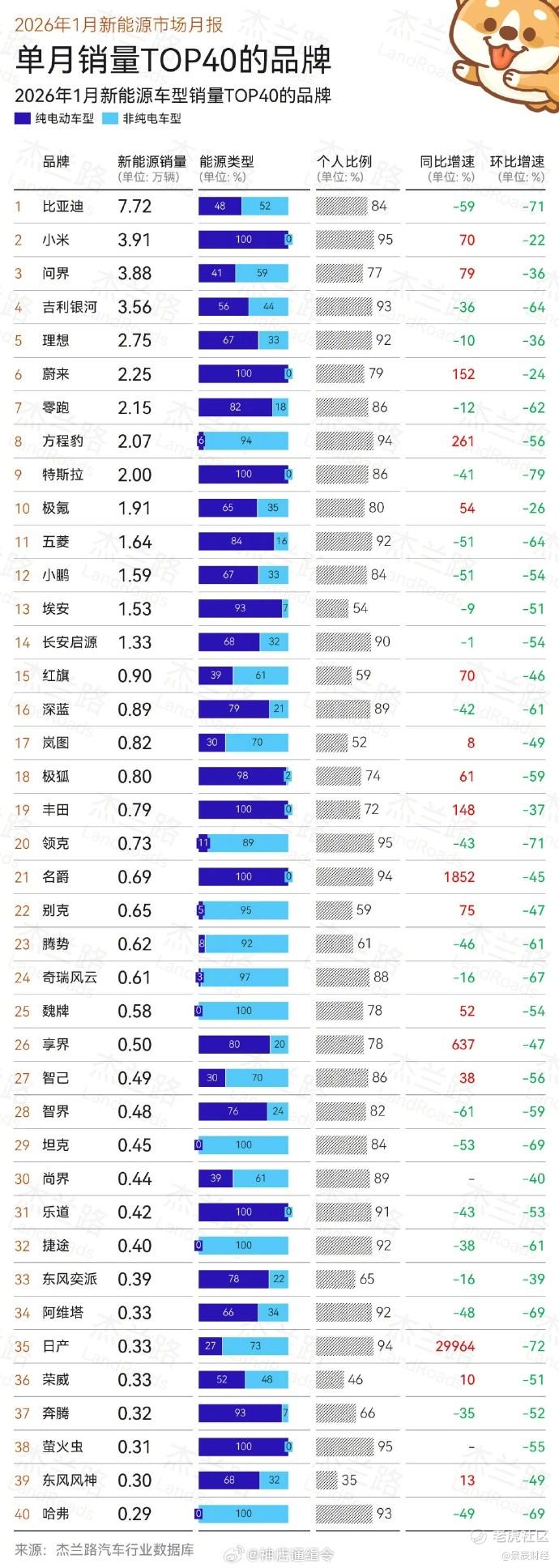 杰兰路公布的数据同样亮眼,小米汽车位居1月纯电车销量第一,1月20万以上市场新能源第一,仅次于比亚迪,位居1月新能源销量第二。