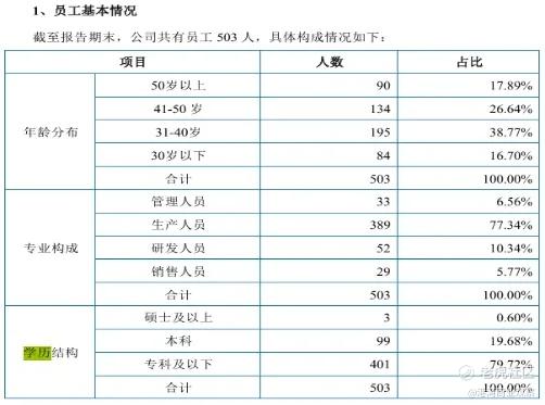 报告期内,公司有员工503人,其中研发人员52人,占公司员工总人数的比重为10.34%。而就公司学历结构而言,成员硕士及以上学历占比仅0.6%,本科学历占比19.68%、专科及以下学历占比79.72。核心技术人员上,闫振伟、马升翼、戚振华三人分别为技术部部长和副部长,学历均为本科。