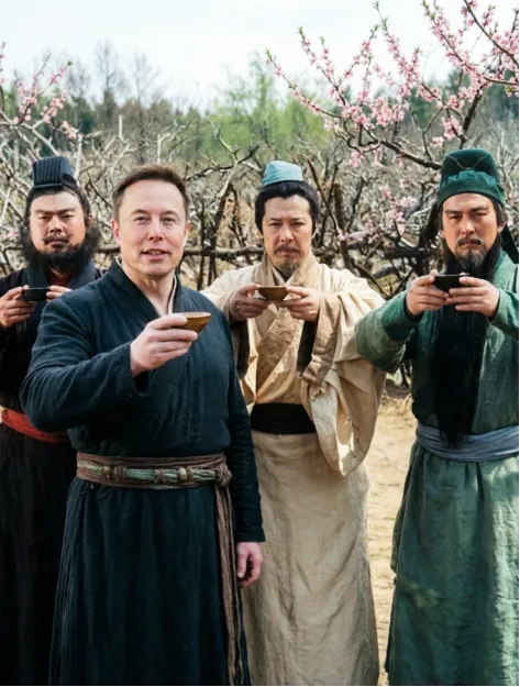2的人物(马斯克)自然地融入图1的场景(桃园结义)中,让他站在刘备的左侧,同样举着酒杯。统一光影为桃园的柔和自然光,人物穿着要改成汉代风格的长袍,但保留图2人物的面部特征。画面构图要平衡,四人结义。