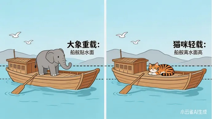 提示词:曹冲称象。一条船浮在水面上,船上站着一头大象,船身吃水很深,水面快要漫过船舷。旁边对比一张同样的船,船上只有一只猫,船身浮得很高。