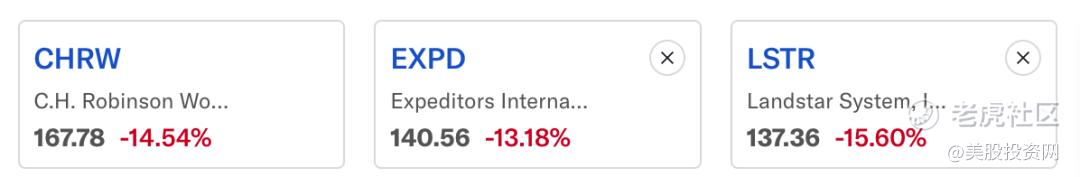 作为行业风向标的第三方物流巨头C.H. Robinson (CHRW),在经历盘中巨震后最终收跌14.5%。抛压迅速传导,华盛顿康捷国际物流 (EXPD) 和 Landstar System (LSTR) 收盘分别大跌13.2%和15.6%。 $罗宾逊物流(CHRW)$ $康捷国际物流(EXPD)$ $莱帝运输(LSTR)$