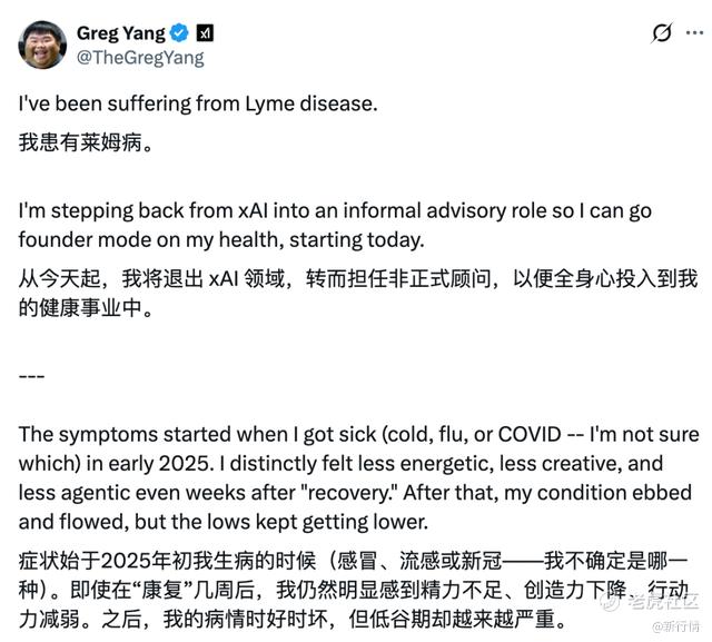 上个月,联合创始人杨格因罹患莱姆病,决定退出xAI的日常事务,转为非正式顾问。他在声明中解释,自己可能早已感染此病,但在xAI创立期间的长期高强度工作,把自己逼得太狠导致免疫系统受损,最终使病情显现和恶化。