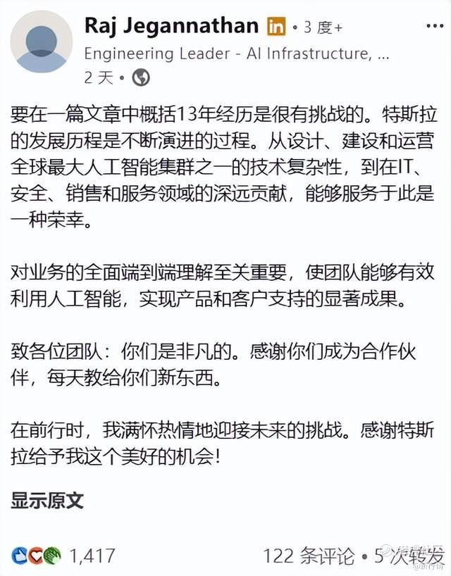 近日,特斯拉副总裁拉吉·杰加纳坦在LinkedIn上宣布离职,结束了13年的特斯拉生涯。