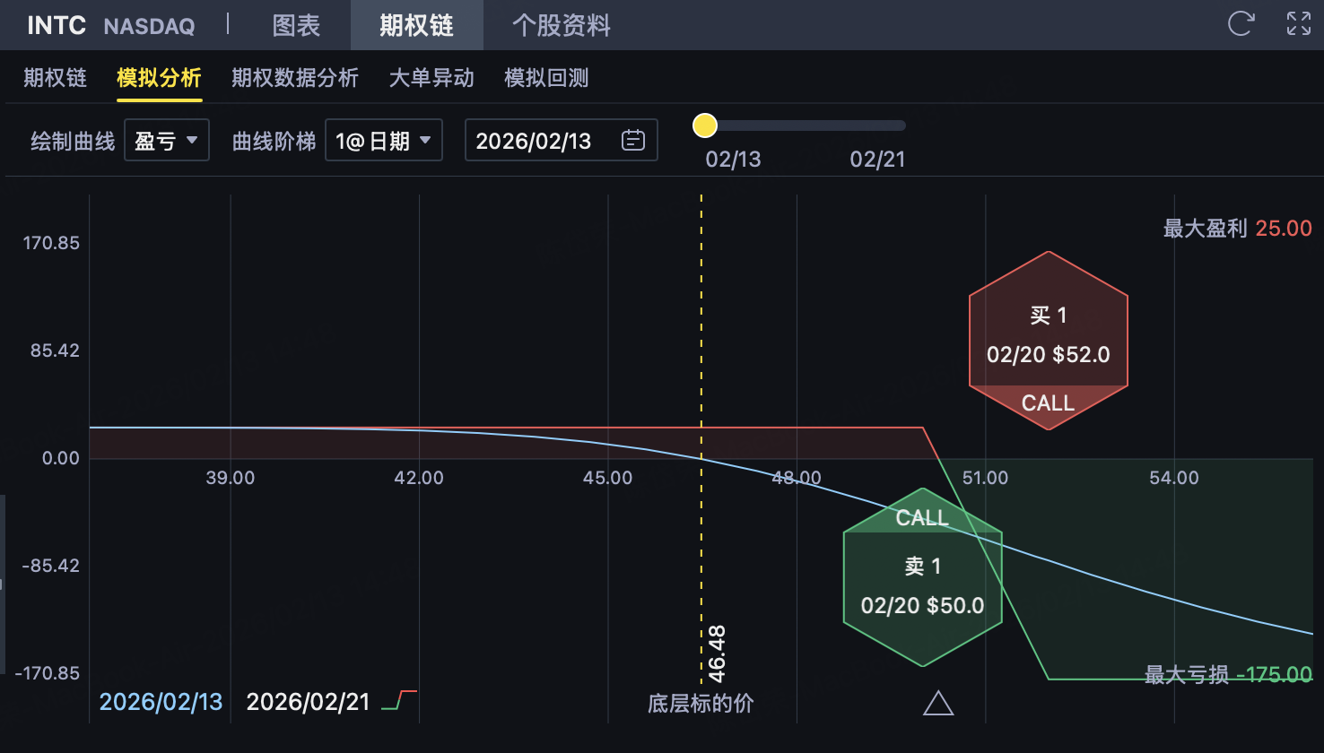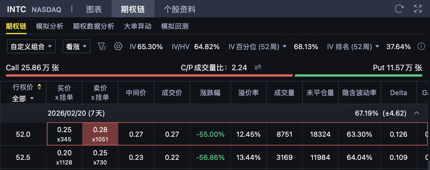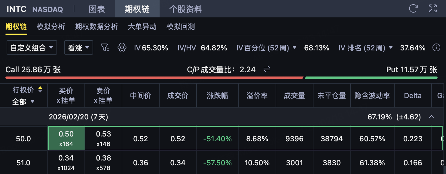 基于上述“上方阻力清晰、市场风险偏好走弱”的组合情形,用 INTC 的熊市看涨价差(卖 50 / 买 52)更像是在押注‘反弹不过线’:只要到期时 INTC 不突破 50,策略可保留净权利金;即便出现意外拉升,风险也被 52 上方封顶(你这组报价净收入 0.23 美元/股、最大亏损 1.77 美元/股、盈亏平衡点 50.23,与“50 附近压力带”逻辑一致)。如果后续指数层面继续受科技权重拖累,这类“收权利金 + 上方封顶”的结构通常比单纯做方向更容易管理回撤。
