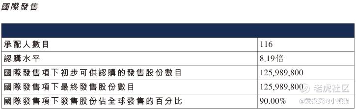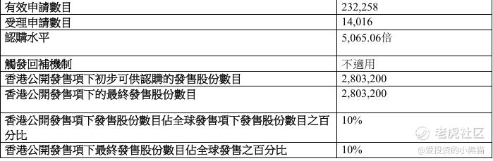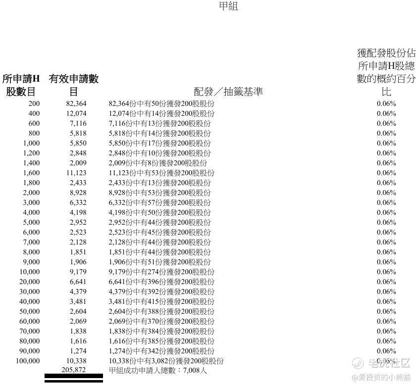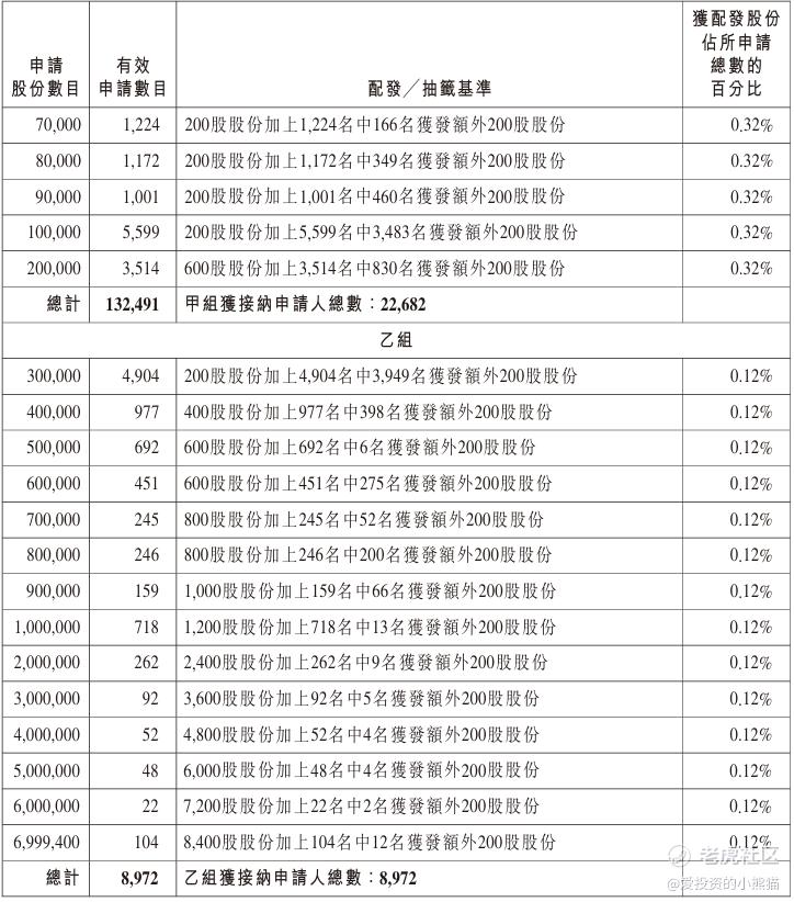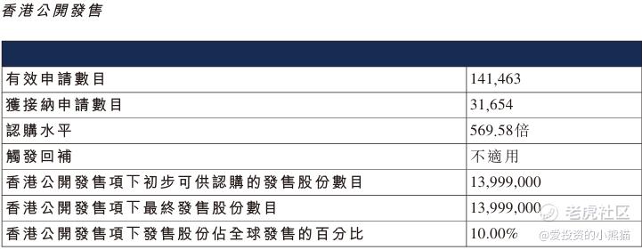 配售情况:141463人认购,这次公配569.58倍,由于机制B分配,无回拨比率,国配有8.19倍,一手中签率0.33%,认购350手稳中1手,同时乙组8972人申购,其中顶头槌申购104张,获配率0.12%。