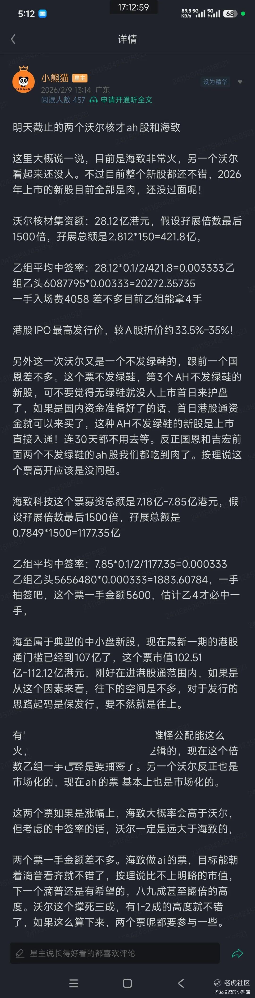 之前在xq里就说海致中签率很低,海致做ai的票,目标能朝着滴普看齐就不错了,按理说比不上明略的市值,下一个滴普还是有希望的,八九成甚至翻倍的高度,沃尔这个撑死三成,有1-2成的高度就不错了,如果这么算下来,两个票呢都要参与一些。一个是高中签率稳赚钱,另一个呢是博弈高中签率和高收益。反正选择两个都不错。