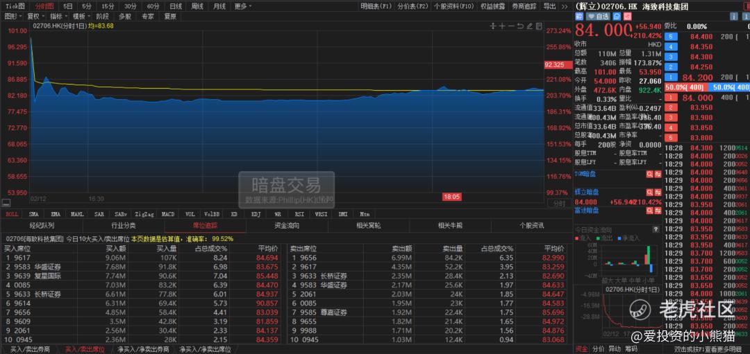 海致科技集团(02706.HK)辉立暗盘以54.00港元高开,稍有回落至最低点53.95港元后,立马冲到最高点101.00港元,再回落震荡,尾盘以84.00港元报收,涨幅为210.42%,振幅173.87%,成交1.10亿港元。