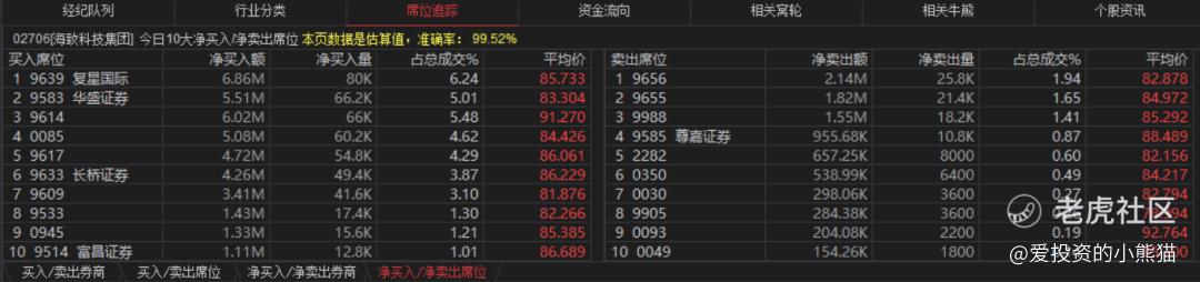 海致科技集团(02706.HK)买盘席位有9639、9583、9614、0085、0945等,卖盘第一席位是9656。