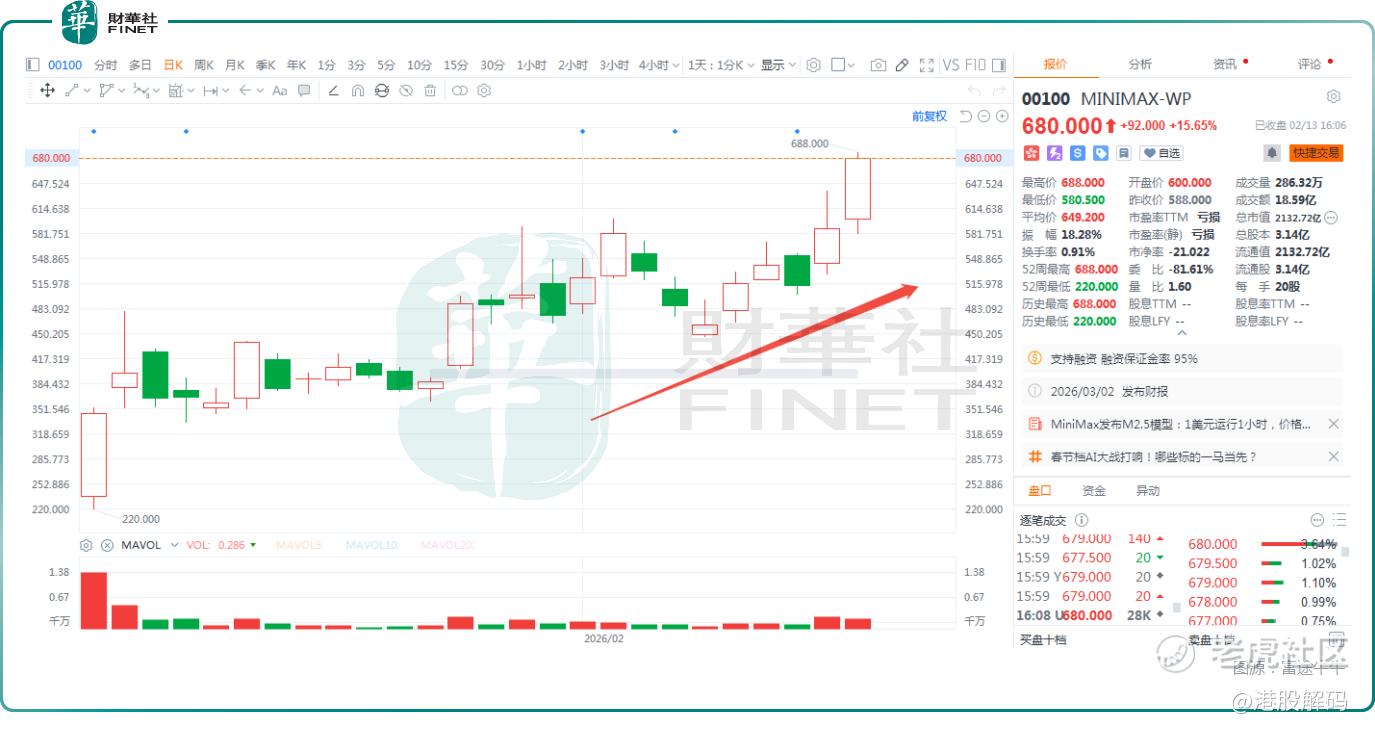 数据显示,2月13日, $MINIMAX-WP(00100)$ 大涨15.65%,再创新高,年内已累涨逾312%; $智谱(02513)$ 则在今日飙升20.65%,同创新高,年内累涨逾317%; $天数智芯(09903)$ 也大涨了14.59%,年内累涨近86%。