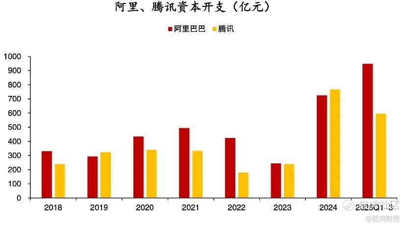 如前文所示,全球主流科技企业在2024年开始纷纷大幅提高资本开支,腾讯前期亦是如此,当年资本开支尚小幅领先于阿里,但在2025年之后增速却开始明显放缓。