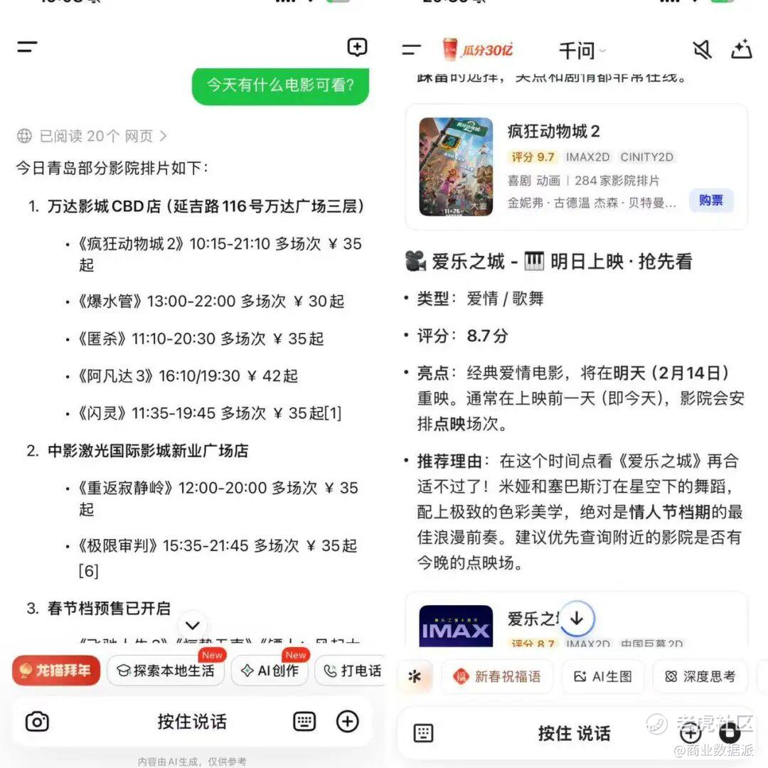 商业数据派试用了一下LongCat,询问“现在能看什么电影”,它只能弹出部分影院排片,但却没有接入大众点评的能力,无法点开影院选票, 更无法购买电影票,而其他平台会自动跳出买票链接。
