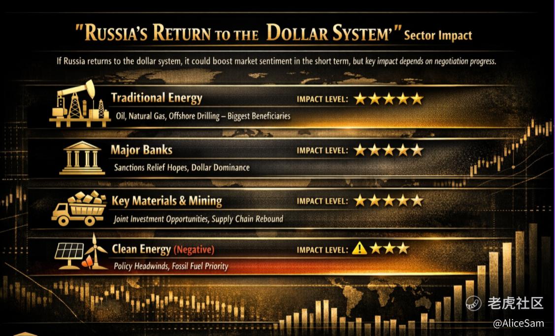 若俄罗斯重返美元体系,将增强美元作为世界储备货币的地位,可能推高美元汇率。大型银行、支付系统公司(如 $Visa(V)$ ,Mastercard若重返俄罗斯市场)都能吃到这一波红利。曾在俄罗斯有业务的金融机构(如花旗、摩根大通),若制裁解除可收回资产。制裁解除将激活沉淀的跨境资产,也会提升投行在俄业务的咨询与结算佣金收入。