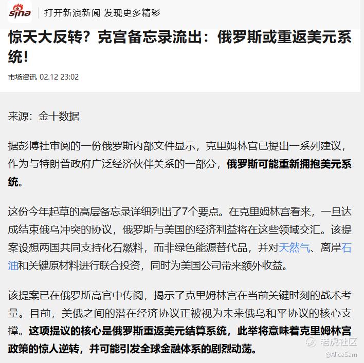 一个重磅新闻,不知道真实性有多少,看到好几个媒体都有类似的新闻发出来,关于俄罗斯或重返美元系统。早前,美国就已提议作为和平协议的一部分逐步取消对俄制裁,这是俄罗斯恢复美元交易的必要前提。但这次克里姆林宫备忘录所设想的方案,好些远不止于此。
