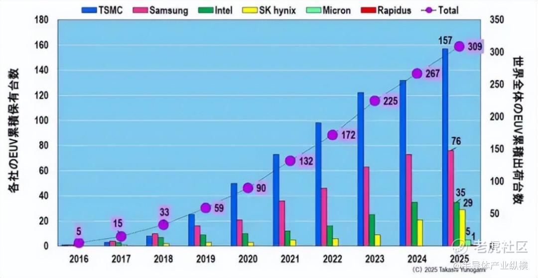 Intel 的 35 台 EUV,是其 IDM 转型的“底气”;SK 海力士(29 台)和美光(5 台)的 EUV 布局,则聚焦于存储芯片的 “工艺优化”。日本 Rapidus 的 1 台 EUV,更像是日本政府推动本土先进制程复兴的 “破冰之举”。这家成立于 2022 年的公司,得到了日本政府 5000 亿日元的补贴和 ASML 的技术支持,目标是在 2027 年量产 2nm 芯片。
