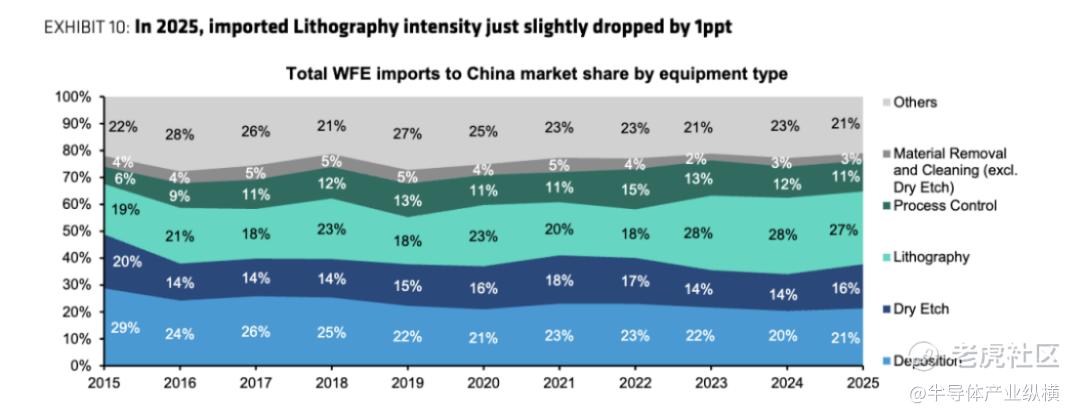 光刻机进口方面,2025年全年进口额与2024年基本持平,仅同比下滑1%,但12月光刻机进口额达23亿美元,创下月度历史纪录。(相关进口指标包括:沉积、干法刻蚀、光刻机、过程控制系统、材料去除与清洁、其他,以及对应总额和不含光刻的总额)
