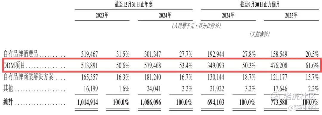 2023年和2024年,鹿客科技来自ODM项目的收入分别为5.14亿元、5.79亿元,在总收入中的占比超过二分之一;2025年前三季度,该公司的ODM收入进一步增长36.4%至4.76亿元,占比也增长11.3个百分点至61.6%。