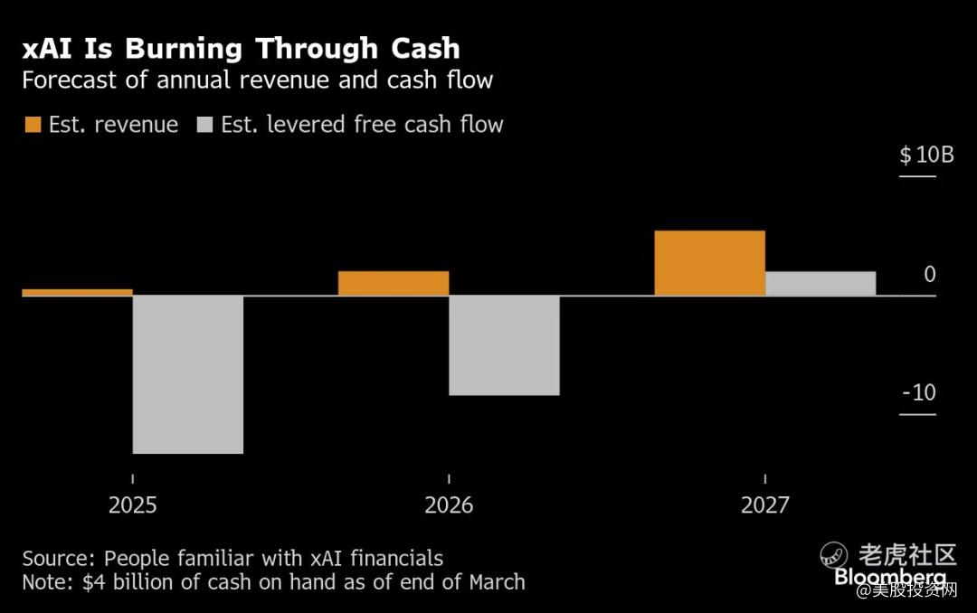 与此同时,根据彭博披露的财务预测,xAI 2025年预计自由现金流为负约80亿至100亿美元,折算月度消耗约6亿至8亿美元,仍处于高强度投入阶段。