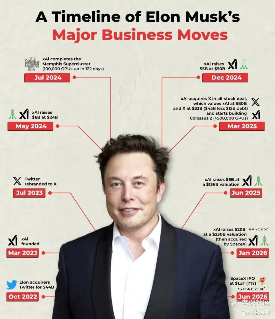 图片由 Marketing Mind 于 2026 年 2 月 5 日发布。可能是一人或多人、杂志、海报以及文字“MARKETING MIND হোমানা CEMUS 埃隆·马斯克重大商业举措时间线 XAI 完成孟菲斯超级集群(100,000 个 GPU,耗时 122 天)2024 年 7 月 xAI 融资 50 亿美元 2024 年 12 月 融资 60 亿美元 240 亿美元 2024 年 5 月 收购 Xin(全股票加 330 亿美元,减去债务后为 450 亿美元)(超过 500,000 个 GPU)2025 年 3 月 X Twitter 更名为 X oX 2023 年 7 月 xAI 估值 1360 亿美元 2025 年 6 月 xAI 成立 2023 年 3 月 融资 200 亿美元 SPACEX 数据2300亿美元估值(随后被SpaceX收购)2026年1月埃隆收购Twitter 440亿美元2022年10月SpaceX IPO 7.5万亿美元(???)SPY SPACEX 2026年6月'。