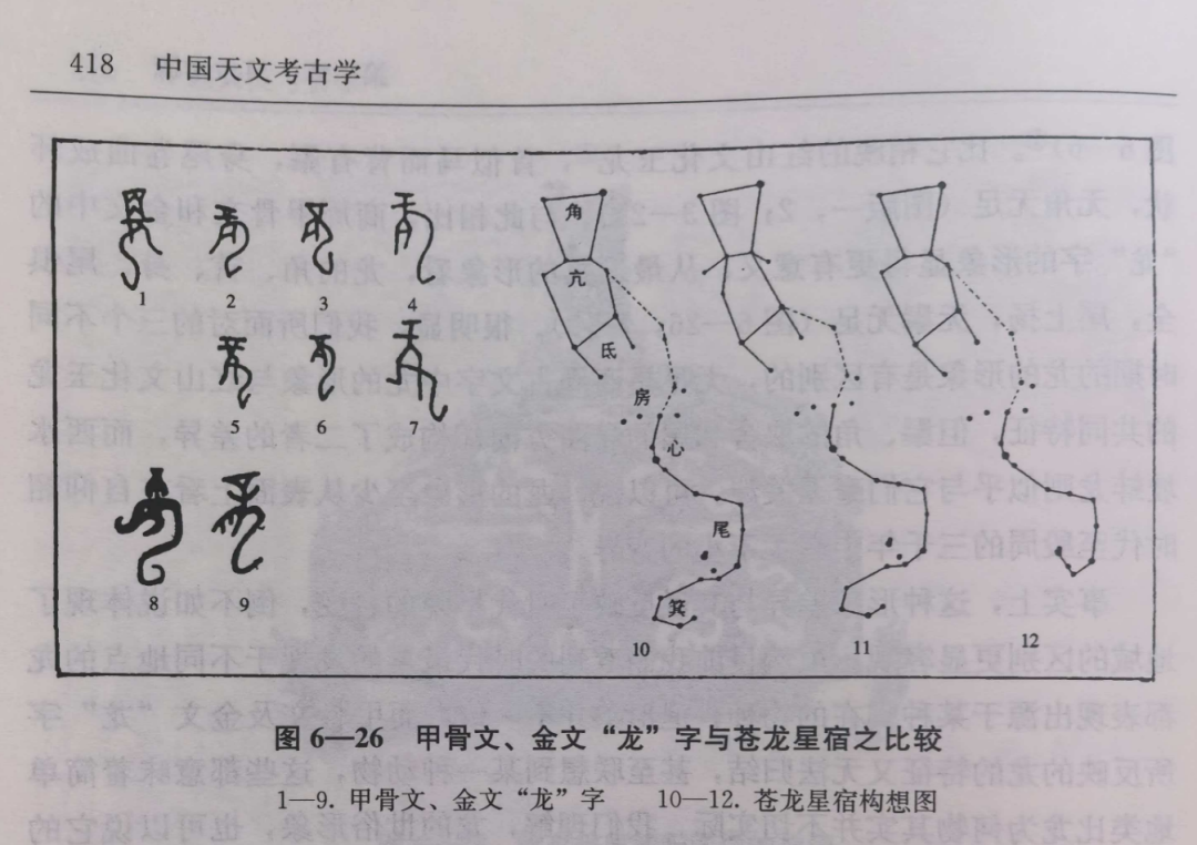 天文考古学家冯时在《中国天文考古学》中考证,龙的形象,来自于星空的苍龙星宿(又叫青龙七宿)。