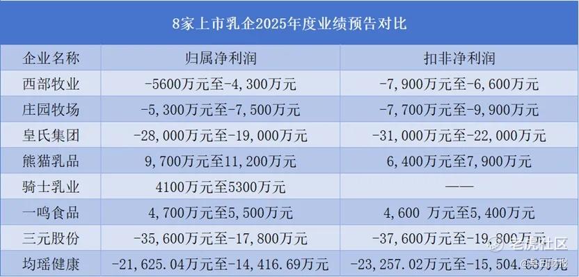 多家上市乳企披露2025年度业绩预告,整体业绩保持承压,共有3家实现盈利。其中,均瑶健康面临的挑战更为严峻,预计2025年净利润亏损1.44亿元至2.16亿元,在上市乳企中表现落后。