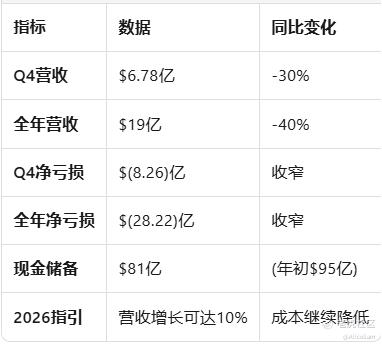 Q4202 净亏损8.26 亿;每股亏损EPS为-2.11(2024年 Q4 为 -2.91)。都亏损这么多了,居然还是超过了预期,他们的预期这么低的吗?[捂脸] 全年2025净亏损28.22 亿。EPS-7.26(2024 年为 -9.28),Q4毛利大概有 2.26 亿,毛利率 大约33%。