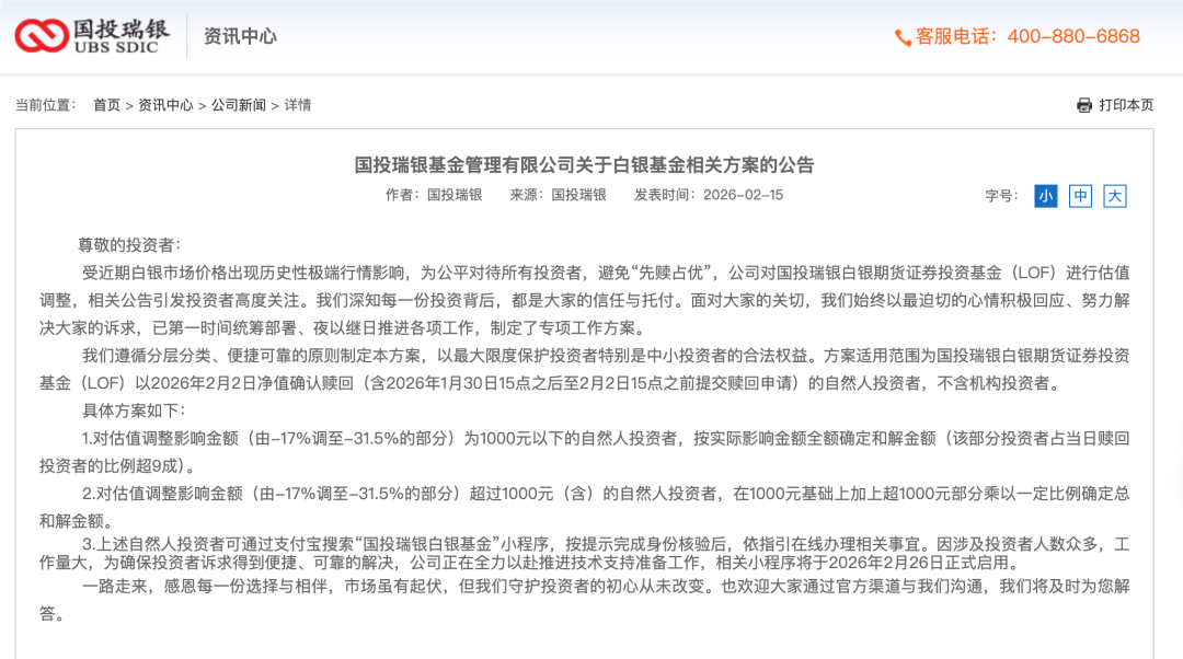 【国投瑞银基金管理有限公司发布关于白银基金相关方案的公告】受近期白银市场价格出现历史性极端行情影响,为公平对待所有投资者,避免“先赎占优”,公司对国投瑞银白银期货证券投资基金(LOF)进行估值调整,相关公告引发投资者高度关注。我们深知每一份投资背后,都是大家的信任与托付。面对大家的关切,我们始终以最迫切的心情积极回应、努力解决大家的诉求,已第一时间统筹部署、夜以继日推进各项工作,制定了专项工作方案。我们遵循分层分类、便捷可靠的原则制定本方案,以最大限度保护投资者特别是中小投资者的合法权益。方案适用范围为国投瑞银白银期货证券投资基金(LOF)以2026年2月2日净值确认赎回(含2026年1月30日15点之后至2月2日15点之前提交赎回申请)的自然人投资者,不含机构投资者。
