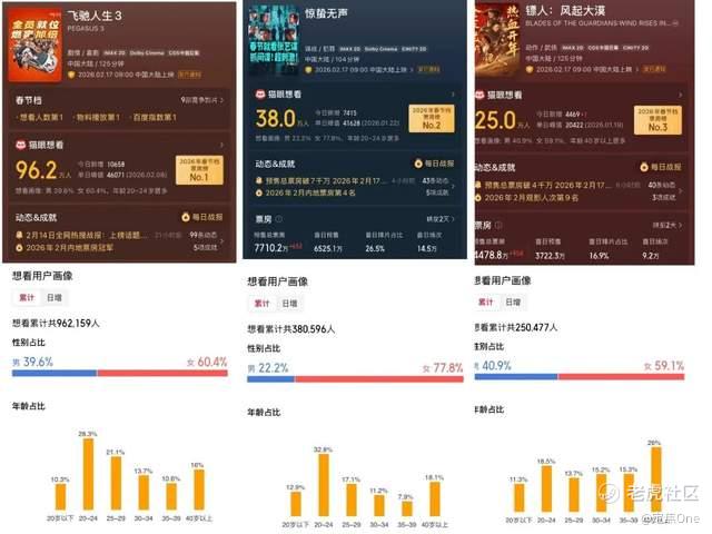 最后,沈腾领衔的喜剧阵容也天然契合春节档的合家欢需求。猫眼数据显示,《飞驰人生3》想看人数已接近百万,其中20-24岁年龄段占比高达28.3%。