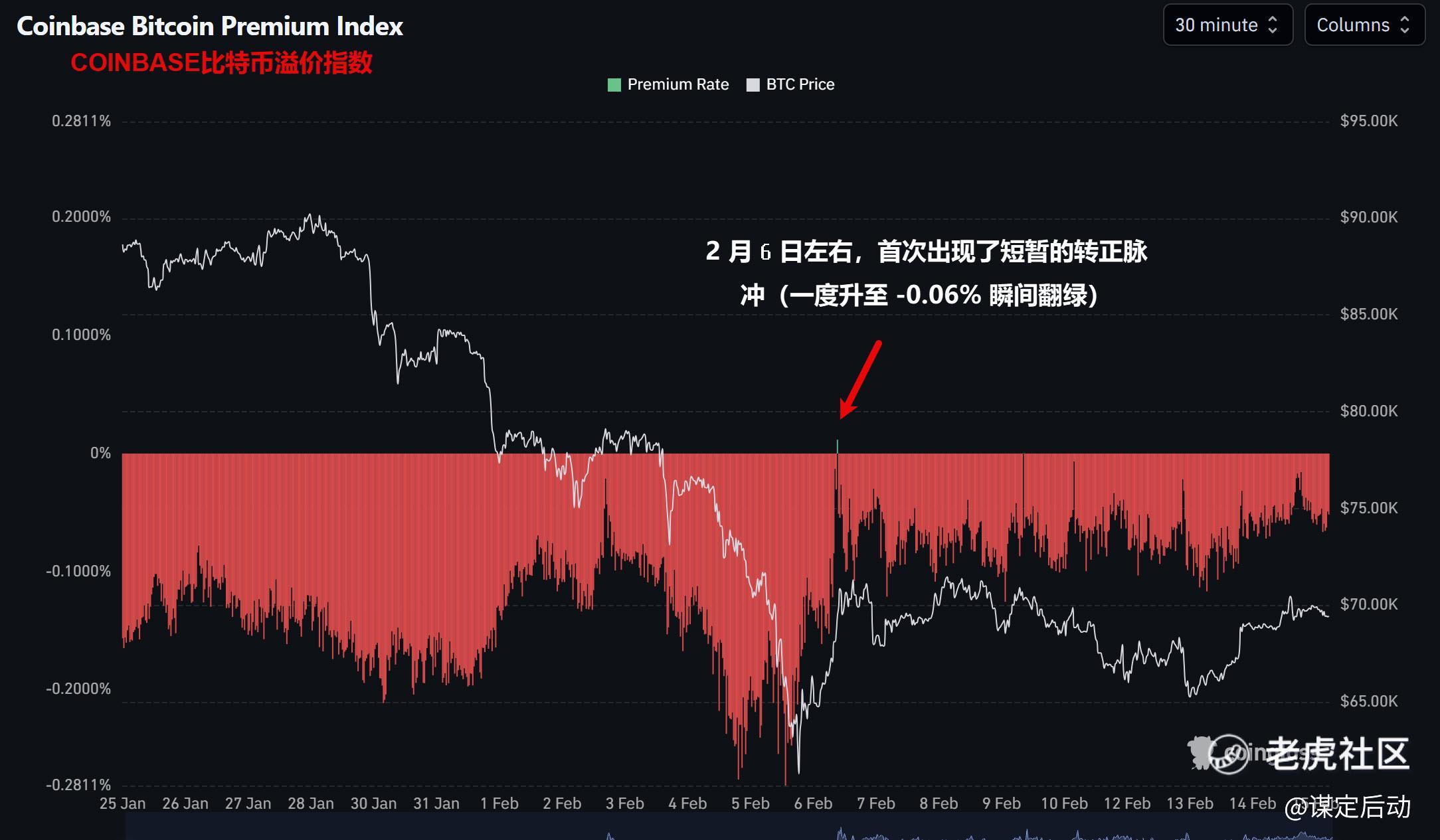 超卖后的脉冲:日线 RSI 曾一度跌至 15 附近的极度超卖区间。Coinbase 比特币溢价指数在 2 月 6 日左右也首次出现了转正脉冲(一度升至 -0.06% 瞬间翻绿),显示美方资金开始进场抄底。