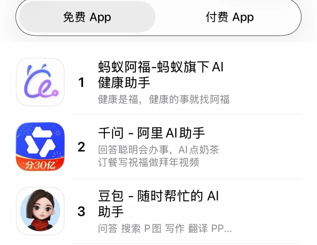 风水轮流转,这次轮到蚂蚁阿福。2026年2月14日,蚂蚁集团旗下的AI助手产品蚂蚁阿福登顶App Store免费总榜第一。相对于豆包、元宝、千问而言,蚂蚁阿福并不主打“通用型”AI助手,而是以“健康”作为切入点,这在一定程度上呈现了它的稀缺性和特殊性,但在另一方面,也限制了它的使用场景,不管怎样,这次App Store免费总榜单第一名的位置终于轮到蚂蚁阿福来坐。
