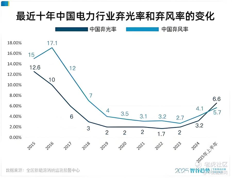装机大增,发电量不增,原因是湖北省的光伏限电。2022年-2024年,湖北省新能源利用率在95%左右。2025年,湖北省新能源装机快速增长,新能源实际弃电率已超过15%。