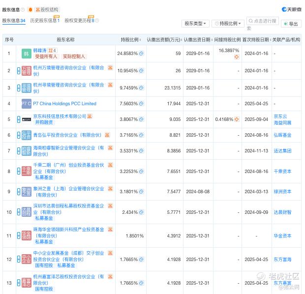 天眼查App信息显示,目前,韩峰涛作为实控人直接持有千寻智能24.8583%股份,间接持股16.3897%;P7持股7.5603%,系第一大外部机构股东。