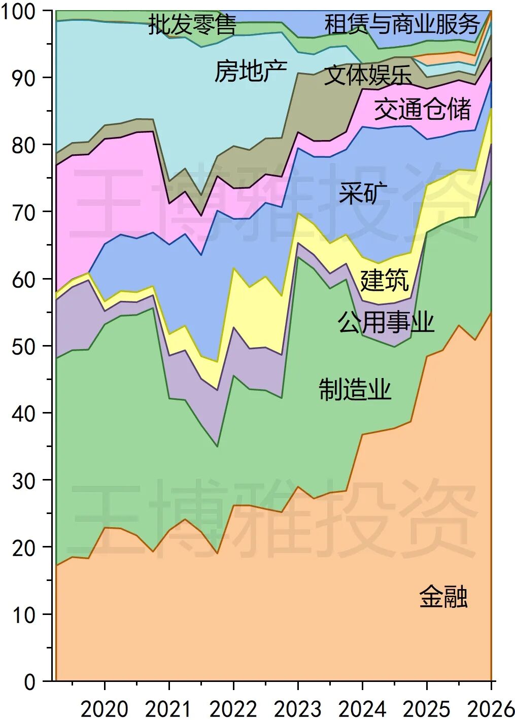可以看到房地产在2022年被迅速减仓;采矿业在2023和2024是重仓,但现在已经被减仓了;金融业则是在持续加仓,不过后续则随时可能因为上涨较多而会被减仓。