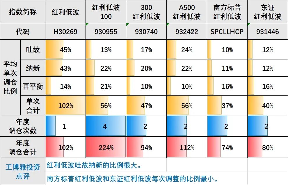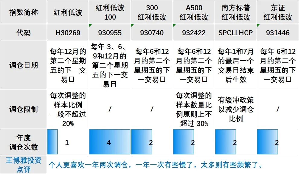 红利低波一年调仓1次,红利低波100一年调仓4次,其余四个指数一年调仓2次。个人认为一年两次更好一些,不至于太慢,也不至于太频繁。
